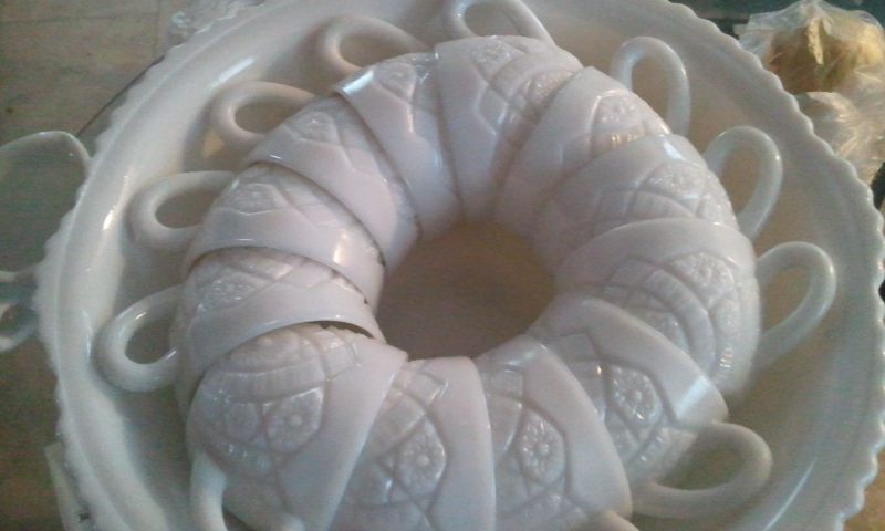I know you all know how much I LOVE my Rain, but I also love “Milk Glass” just as much (I have such a fetish for it, it’s crazy!) and I received a GREAT gift from my friend Christina’s Mom last week. A beautiful 1950’s Milk Glass punch bowl set! Can’t wait to break it in with a nice Sangria soon and a side of fried olives!