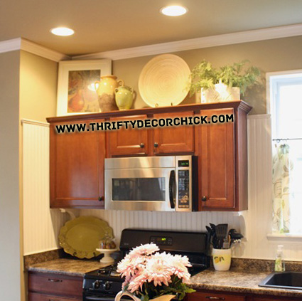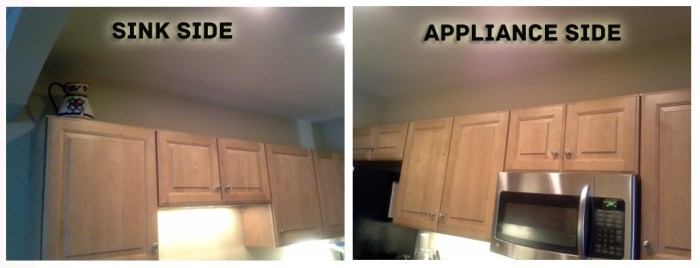 So after reading a bit, I noticed my daughter was sleeping way too long this morning and when I went to wake her, she had a fever of 102.3 and off I was to get her meds, make her tea and plan on making some soup with the wonderful healing powers of turmeric in it. While she’s out of commission and my Naldo is commissioned to the tube watching sports, I found myself puttering around the house. Now as if I didn’t have ENOUGH projects- I find yet ANOTHER! The top of my kitchen cabinets in our new place is driving me absolutely bonkers! See why……