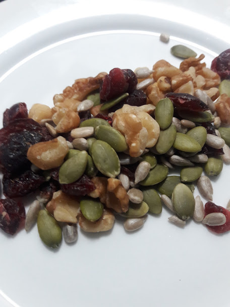 I am so grateful and relieved to be in our “Steppingstone” apartment! I spent the day hanging curtains, rearranging furniture, prepping my pantry and trying to make my small but mighty kitchen space work for me. It was a productive day. I only had time for a light lunch of salad and promised to share my salad topping mix with you. I simply mix dried cranberries, hulled sunflower and pumpkin seeds and walnuts together and store them in a covered container. When I want them (depending on what I am having) I just sprinkle them on plain or I dry roast them in a pan and put them on top of salad, ravioli and sauce, pizza, popcorn, yogurt…YOU name it!