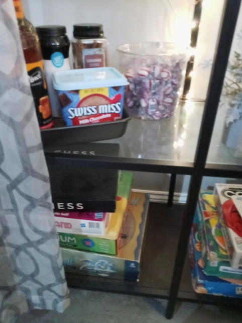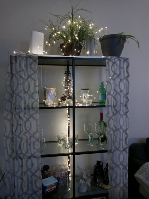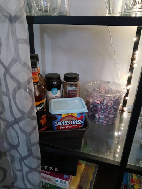 Top Shelf: “Peace” memories of Mom, Dad, Nephew and my twinkly Eifel Tower mini 2nd Shelf: Cocktail bar in search of the perfect decanters. 3rd Shelf: Hot Chocolate Bar in search of some fun Winter mugs. 4th Shelf: Game night in search of a stand-up popcorn machine. I love my plants on the very top as well, in progress.