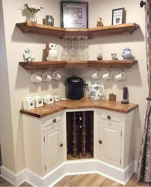 Don’t you just LOVE this Coffee/Wine corner idea?? I am Obsessed! I am also convinced that when i get tired of my Etagere, THIS will replace it. I can add under shelf lighting for my twinkle light fix.