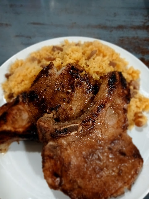 One of the easiest dishes is this Asian flavored pork chop recipe. Marinate bone-in pork chops in a marinade of soy sauce, mirin, garlic, ginger, sesame oil, onion powder, brown sugar, cumin, gojujang and/or sriracha. You can marinate as little as an hour or overnight. If you marinate overnight, bring the chops to room temperature before grilling. You can grill them on an outdoor grill, an indoor stove top grill or in a grill pan. You can even just cook them in a fry pan, they are still delicious. Cook about 5- 6 minutes per side. They are delicious served with plain white rice, fried rice, and even JAG!!