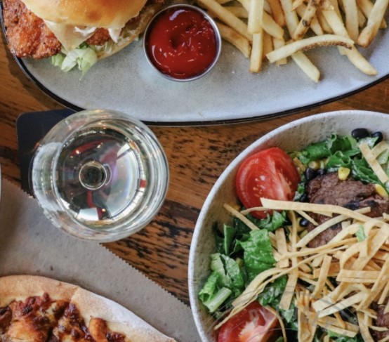 They offer wings, nachos, pizza, salads and sandwiches, and even quinoa bowls. The mains include dishes like: chicken, steak, salmon, and fish and chips. They even have dessert like birthday cake donuts.
