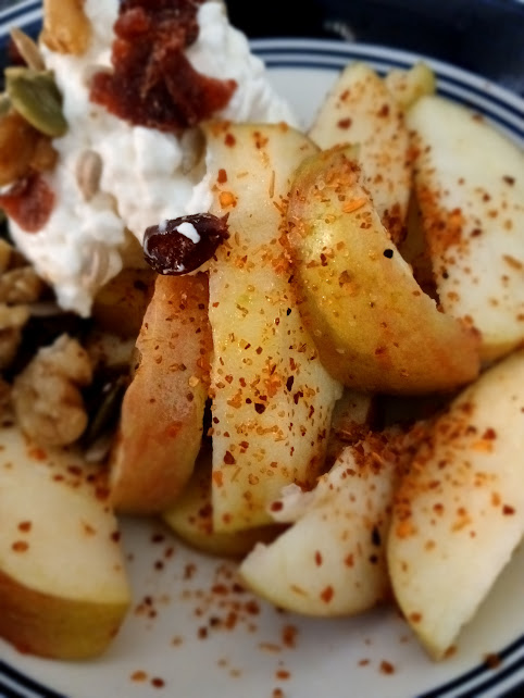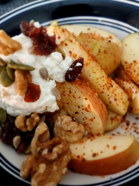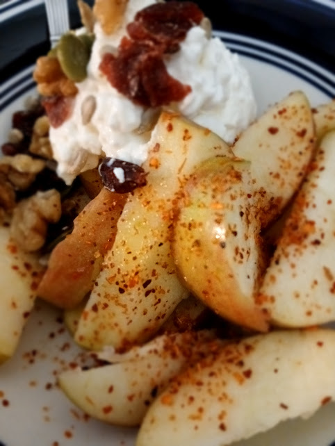 On my journey to getting back on a healthy track, my breakfast this morning was creamy cottage cheese with mixed nuts, my favorite fuji apples in lemon juice and tajin. I felt so refreshed and restarted with my huge cup of turmeric, ginger, cinnamon, honey tea of course!