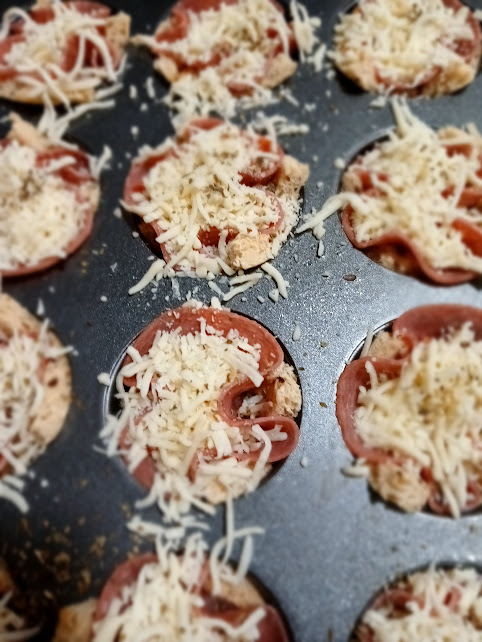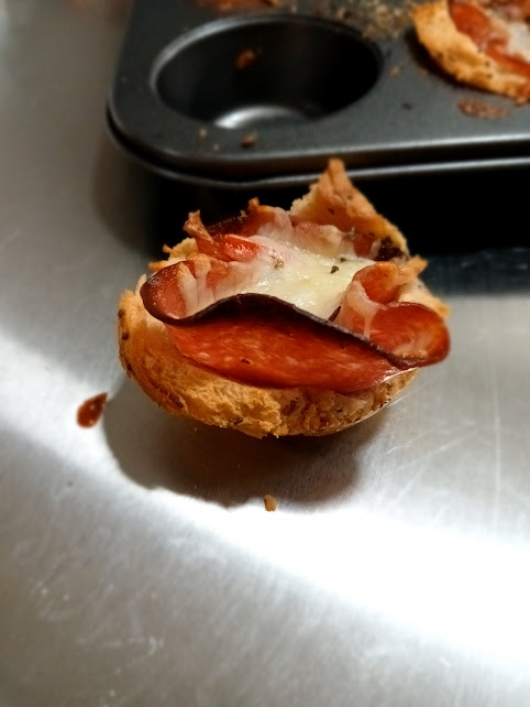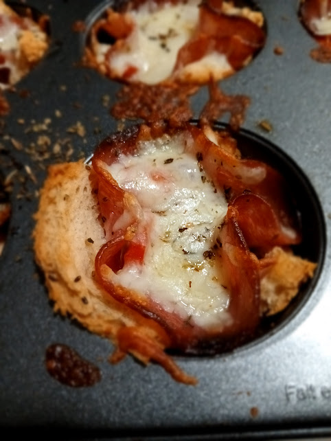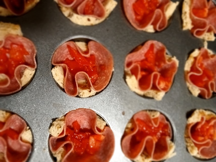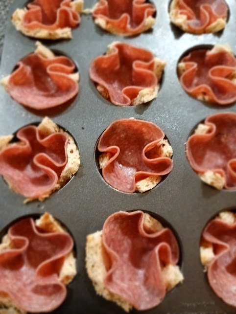 I already planned and prepped my lunches for the week last night and took my walk this morning, so I am ahead of the game! I am in love with Sola Bread! It’s a low carb bread that tastes delicious with only 1gram of carb! It comes in different flavors, and it fits my diet to keep my diabetes at bay. It’s really great for anyone on a low carb diet for any reason. I cut off the edges, lightly brush with flavored butter or olive oil, stuff into muffin tin with 1 slice of salami, tomatoes, shredded mozzarella and Italian spice bland then bake at 350 for 15 minutes. They come out so crispy and melty. You can cool and freeze in a single layer then put them in a bag and take out as needed. Lift the salami, add Italian dressing, chopped pickles and onion and it’s like a mini-Italian grinder snack.