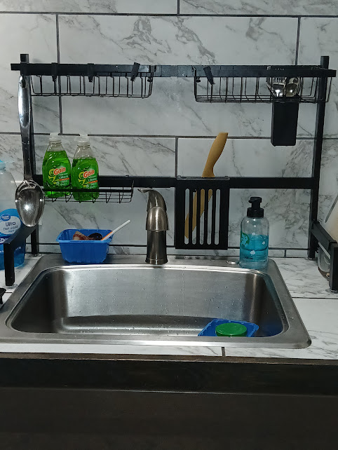 I am in LOVE with this new dish drainer! It holds everyhting in it’s place and drains right over the sink and looks nice in this kitchen as the apartment is a bit on the ‘loft’ looking side. I got it at Walmart online, it’s very popular on TEMU as well but way less expensive at Walmart online, almost half the price.