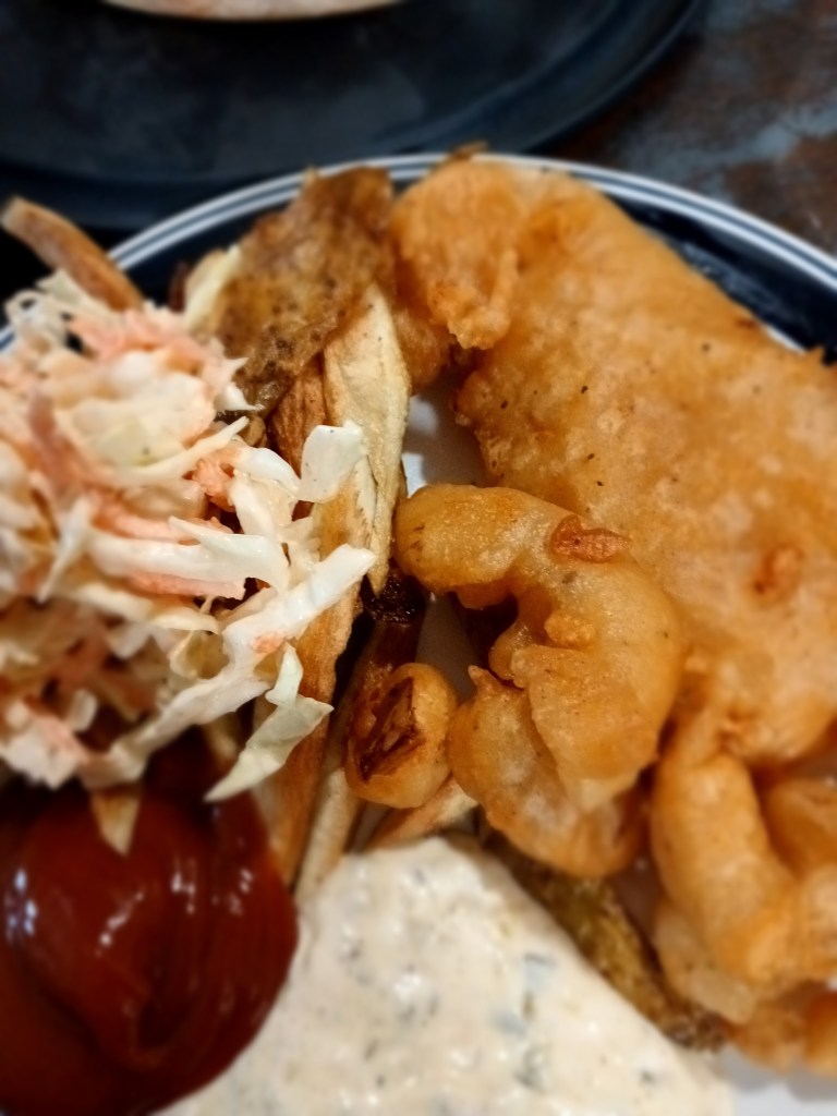 I add a full Sam Adams beer to some seasoned flour and cornstarch in a bowl and mix until it’s like pancake batter. I season the flour with salt, pepper and Badia. I flour the cod filets with flour first and let rest, then dredge in the batter and fry until golden and crispy. Drain on a rack above a sheet lined with absorbent paper. Serve with homemade French fries that soaked in cold water overnight to remove starch for crispiness.