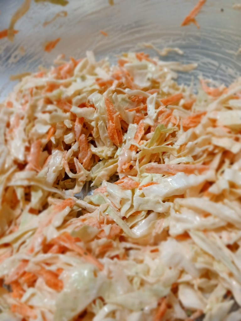 Freshly grate cabbage and carrots. Grate an onion on the fine side and use the juice, salt and pepper and Badia. Sprinkle with a little sugar or some honey and fresh lemon juice. Mix in homemade mayonnaise or Helman’s real. To Make Mayo: In a blender, add 1 egg, 2 teaspoons dry mustard or Dijon, 1 tablespoon white vinegar and 1/2 teaspoon salt. Turn on mixer and pour 1 cup vegetable, or olive oil by the drops to begin and slowly add more as you hear it thickening. Add to coleslaw. Add lore lemon for brightness if needed.