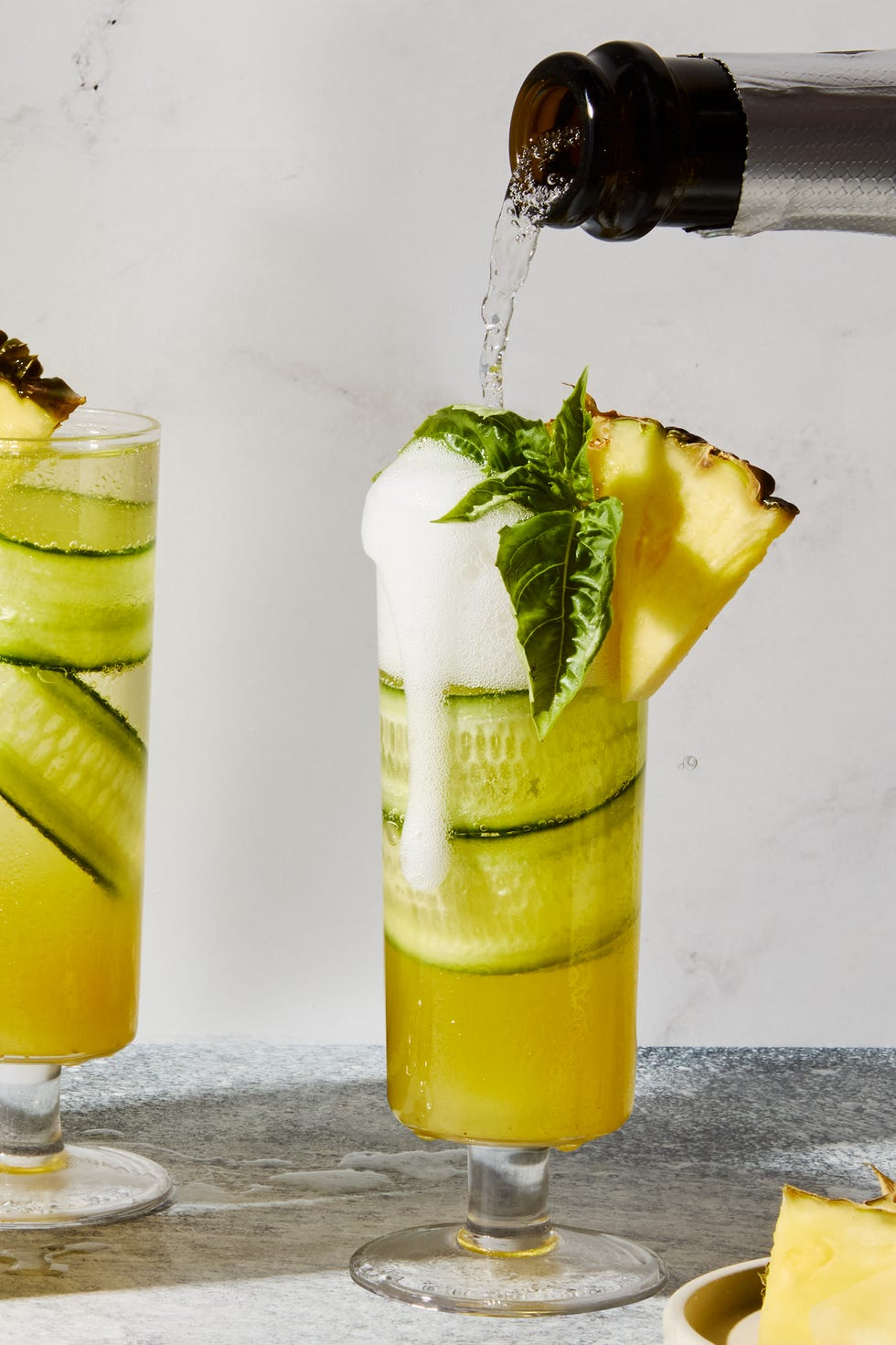- Pineapple wedge and fresh basil leaves, for serving (optional)