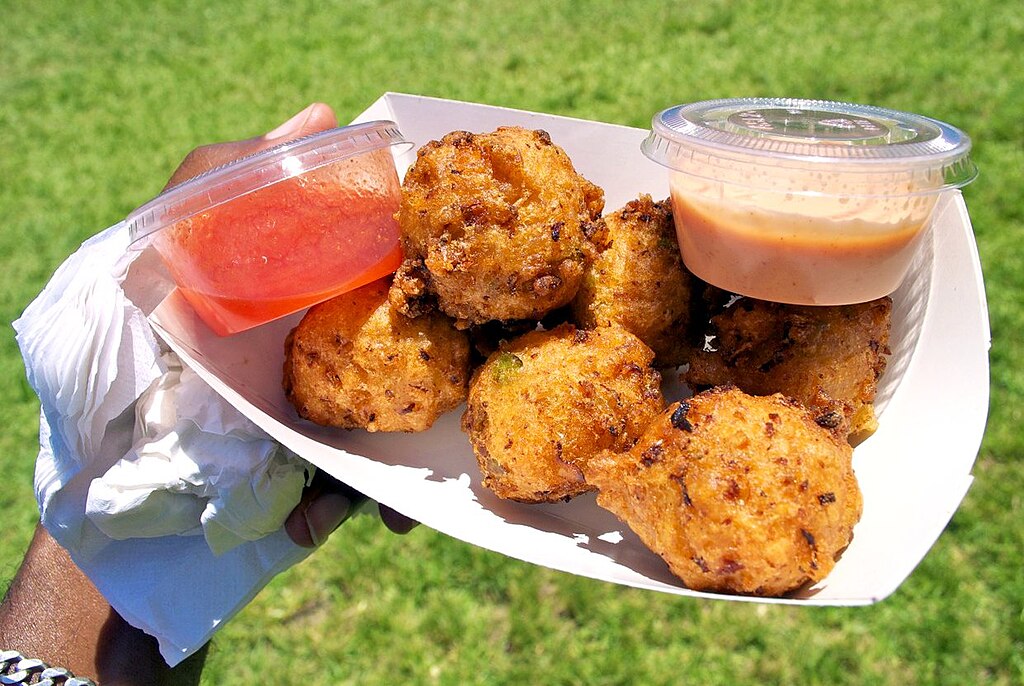 - Meat mixed into a seasoned fritter batter of: cornmeal, chopped onions, peppers, celery and jalapeños.