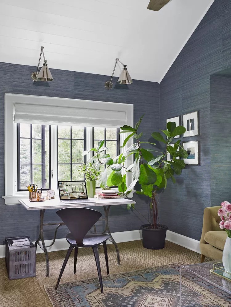 So, this desk and room setup is my ultimate favorite right now! I love EVERYTHING about it; rug, wallpaper, fireplace, throw on hassock and of course the desk and chair. I feel a work area make-over coming!