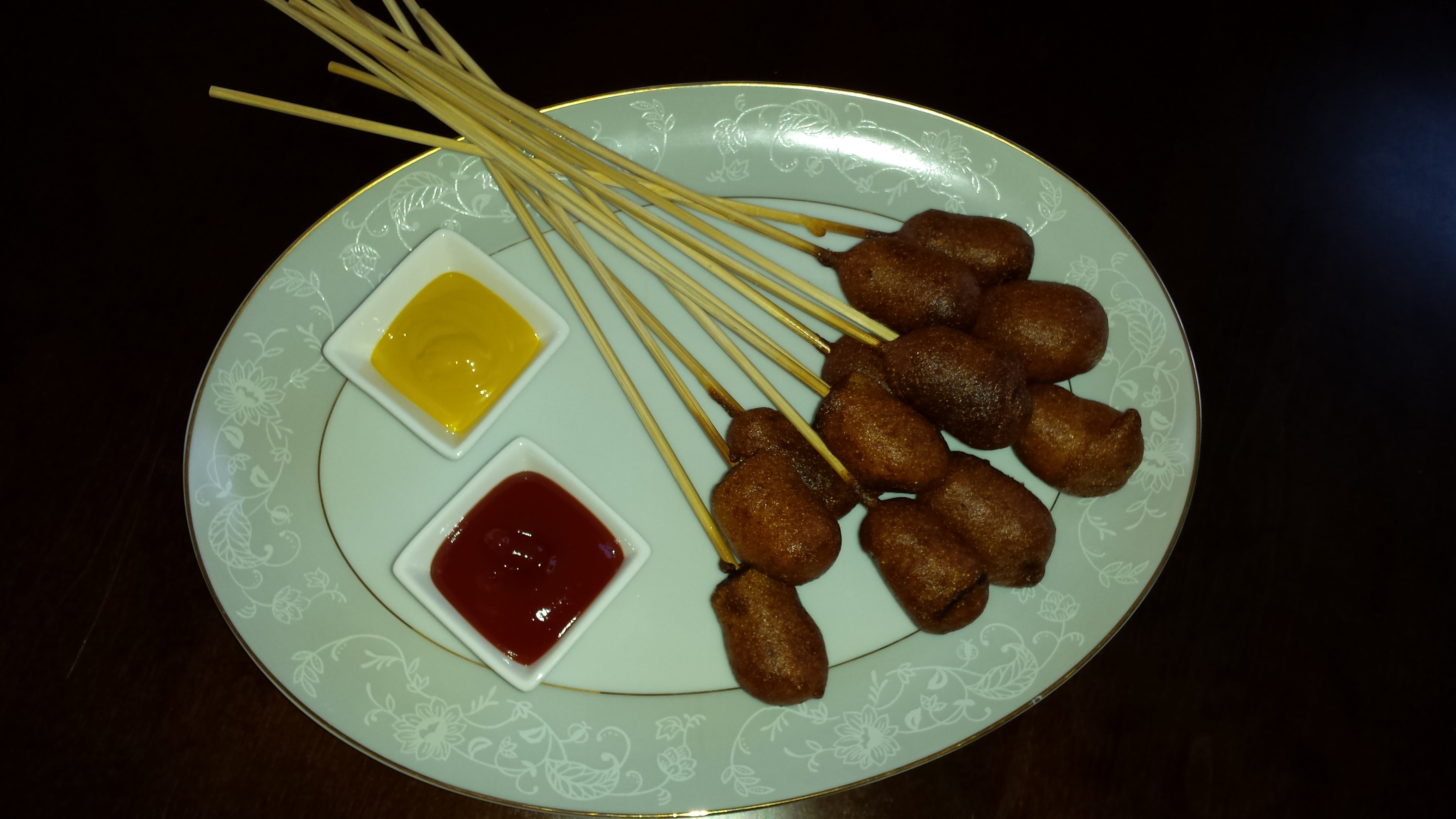 My daughter likes corn dogs and bought them from the freezer section in the market one day and they were not good. They are not good anyway, but I decided to make them at home. I used Kayem beef hot dogs (I use vegan ones sometimes as well) and I cut them up into bite sized pieces. It also makes them easier to dip and fry when they are this size. I make a batter out of cornmeal, flour, sugar, milk, egg, baking powder, oil and honey with Badia seasoning. Use wooden skewer sticks, dip and swirl hotdogs in batter poured in a drinking glass to make it easier to dip. Fry in corn or canola oil until golden. Drain on a rack. We only have these about once a year if I can control it. LOL