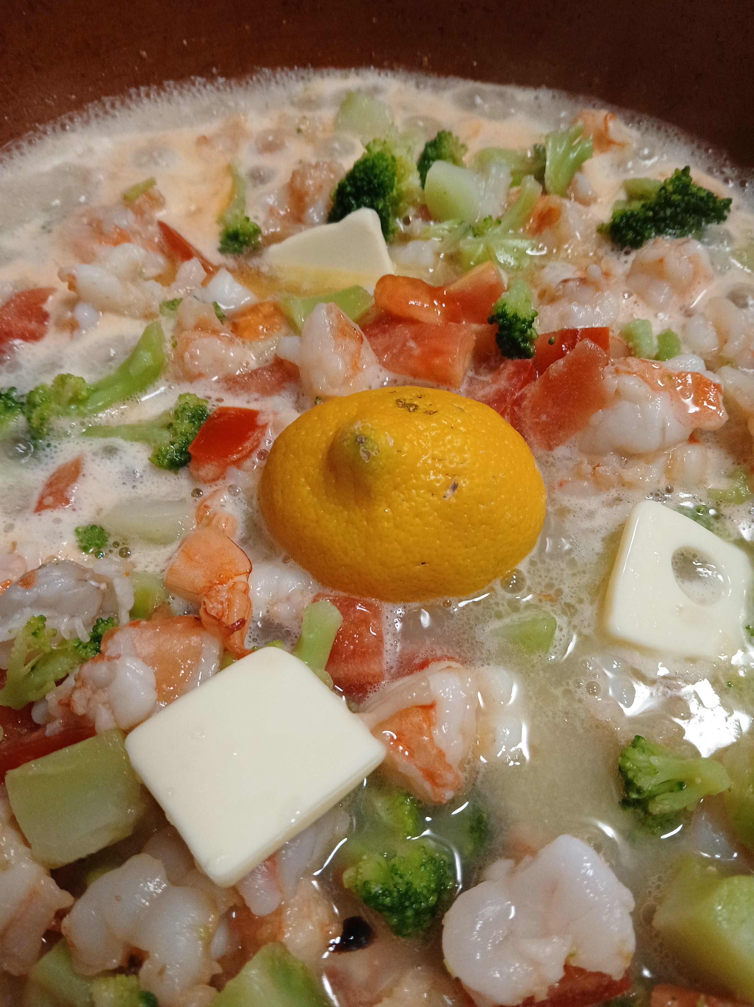 I add roasted garlic butter, chopped tomatoes, broccoli florets and Badia to some shrimp.