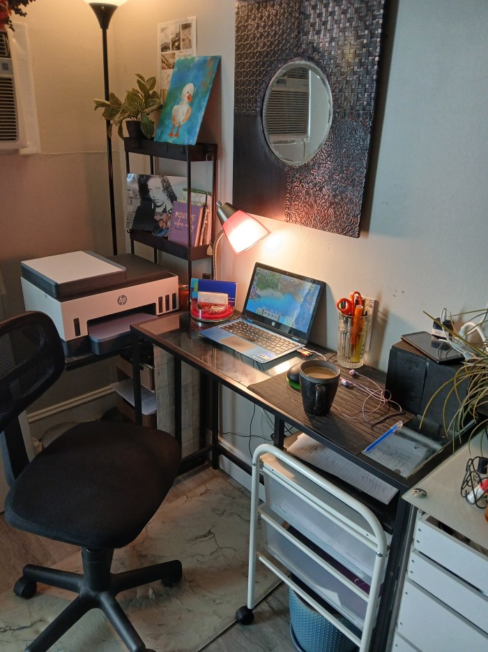 I REALLY need a designated office for sure and have had a few great spaces in other apartments we lived in, so I miss it so much. However, this little space is shaping up quite nicely! I had the printer on the left side, but my heater is there for the whole room, so I had to move it to the right. When it’s on the left, I lose the extra writing desk that’s in the photo above. I must have the little writing area, so the winner is the “After” photo (printer on the right). The best part is, I can always change it around at any time. I need a new anti-roll clear mat for under my chair as I am using my mat for under the sink when I wash dishes, but it’s next stop is to the garbage as my chairs roller wheels have damaged the cushioned rug. Printer on the left photo below… (another “before” photo as well)