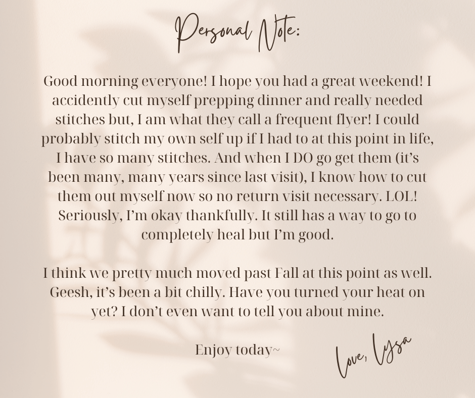 Is it me or is time just flying by? I think this is the shortest fall on record for me. I am quite sad to see it on it’s way out! I just saw the most beautiful red tree in a neighbor’s yard for the first time yesterday and it is so beautiful! I don’t know if I haven’t been looking or if it turned overnight! It’s so vibrant it looks like the leaves just turned within the last day or so, I am positive I would have noticed it before yesterday. That’s also a reminder of how fast the season is going…or gone I should say. I hope you enjoyed your fall no matter what you did.